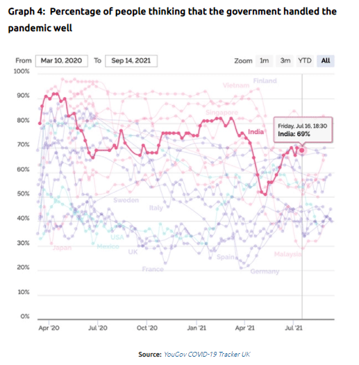 All factors considered, the stark contrast in terms of outcomes such as case and death burden between India and China in their respective approaches of pandemic response was a result of COVID-19 in India putting a part of the governance structure which was historically the weakest—its underfunded public healthcare system—through an extreme stress test. In China, the same authoritarian system which suppressed information about the pandemic initially, threw the full weight of the State apparatus behind containing the virus, and succeeded, till vaccine supplies were scaled up. It is undeniable that COVID-19’s human cost has been huge in India. However, somewhat counterintuitively, the percentage of citizens thinking that the government is handling the pandemic “very” or “somewhat” well has been consistently high in India, barring dips during the devastating waves, only to go up again (Graph 4). Understandably, the graph has no data from China.