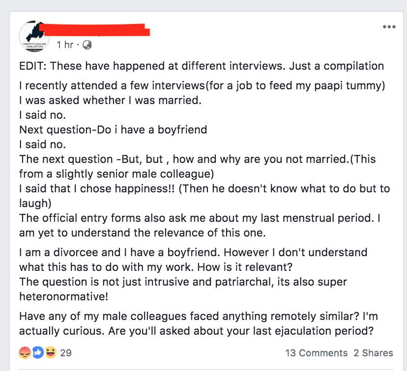 It also justifies discriminatory behaviour, such as denying promotions or asking women during interviews about their “family life” because a family will mean struggling with work.