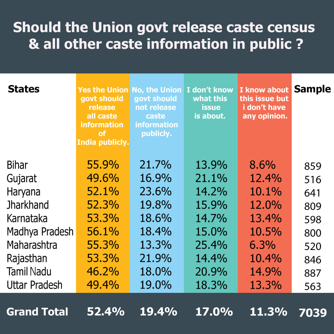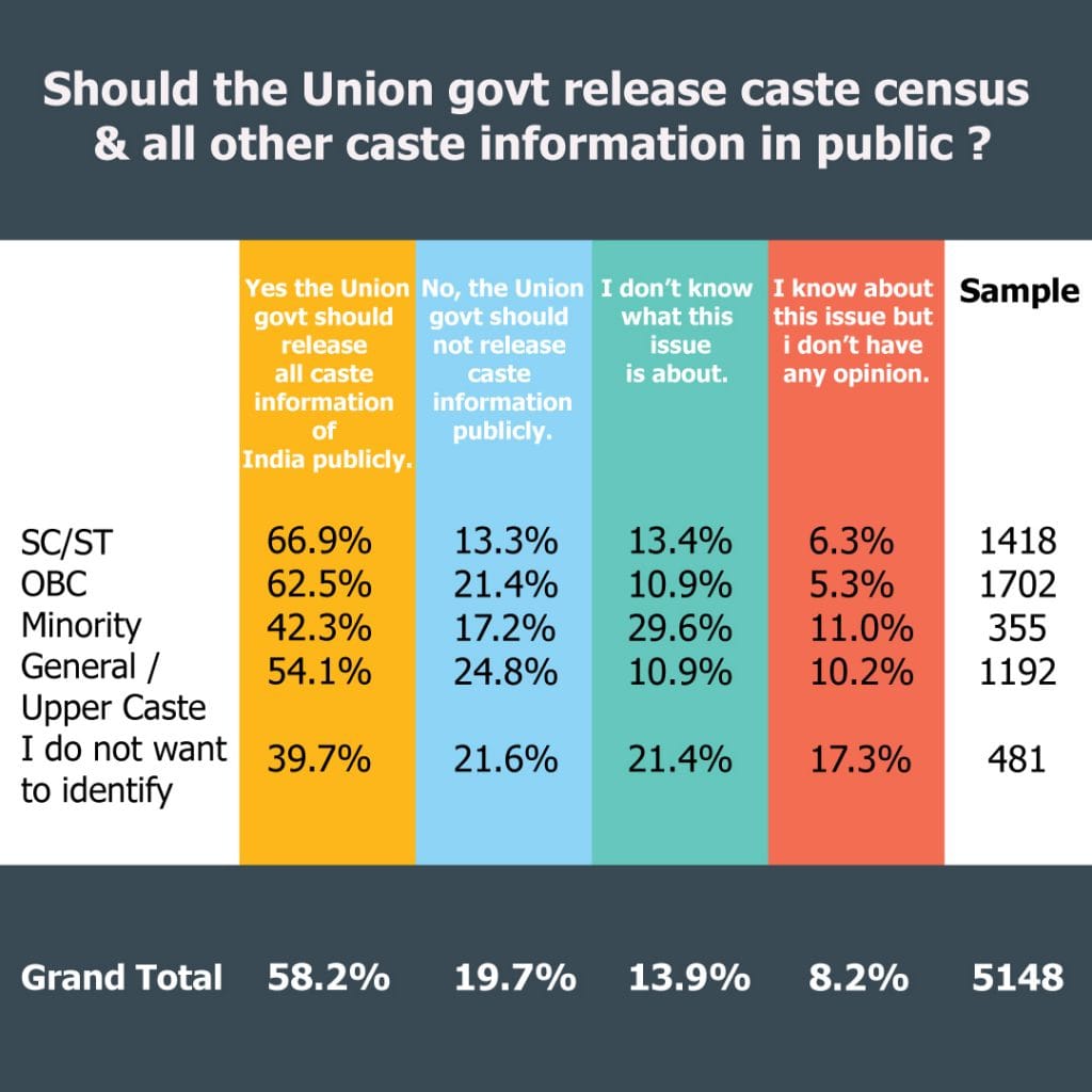 Overall, 52 per cent of Indians surveyed wanted the Union government to make public the detailed caste census information. Among the rest, 28 per cent either did not know about the issue or did not have an opinion. Only 20 per cent said this information should not be made public.