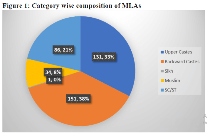 Figure 1 below provides description of caste/category and religious profile of newly elected MLAs. I have categorised them in five broader categories — upper castes, Hindu backward castes, SC/ST, Muslims, and Sikhs.