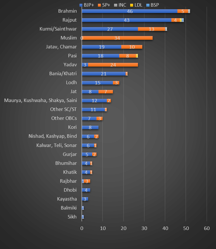 All 34 Muslim MLAs belong to the SP. The BJP had not nominated a single Muslim candidate, but its ally Apana Dal (S) had from the Suar Tanda constituency of Rampur district, against Azam Khan. The BJP has one Sikh MLA from Bilaspur constituency in Rampur district.