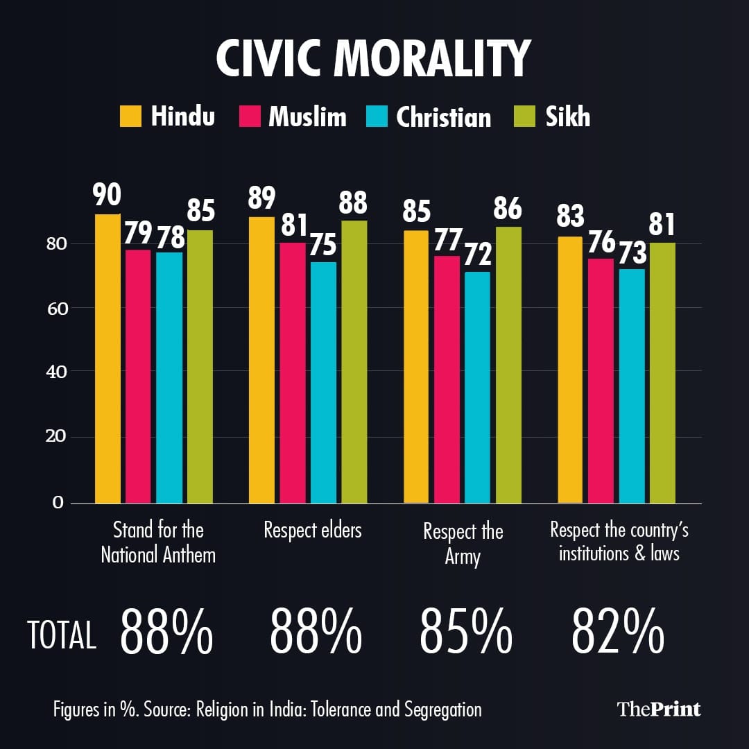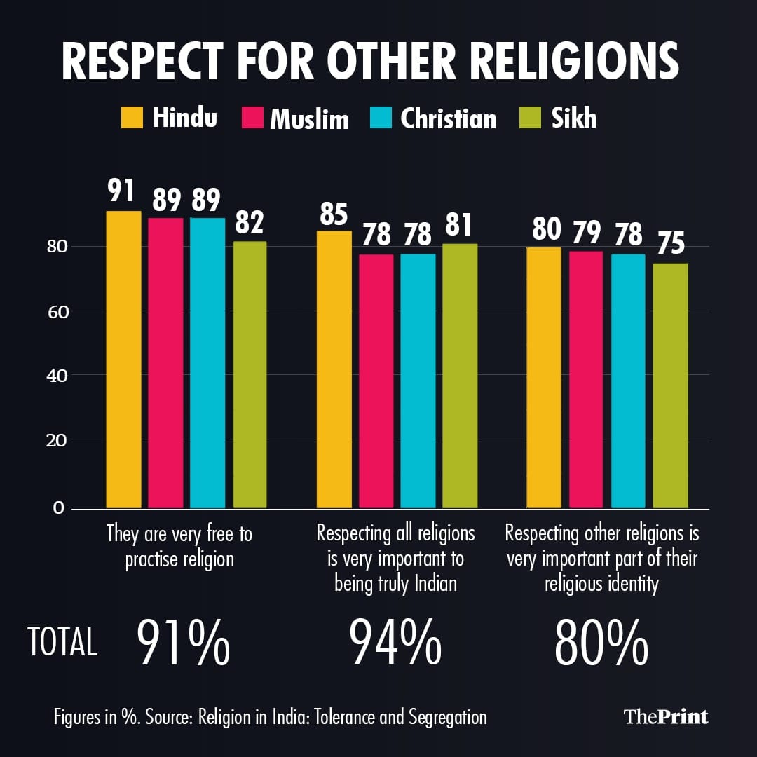First, overwhelming majority of Indians believes that India belongs to all religious groups. The respondents assert that showing respect to all Indian religions is a basic moral requirement to be identified as ‘truly Indian.’