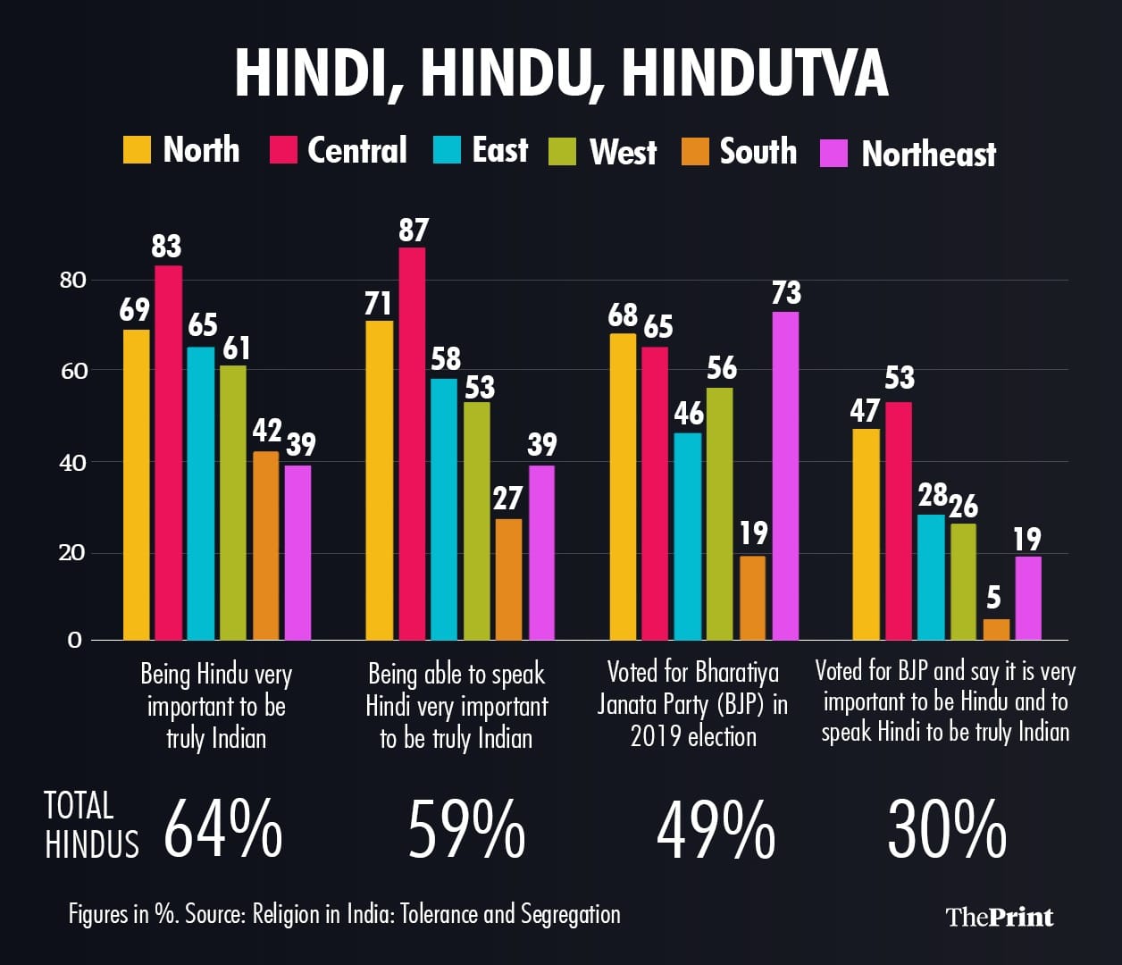 Finally, the rise of Hindu nationalism is the fourth aspect of contemporary national identity. The report shows that a sizeable number of Hindus (64 per cent) think that they are truly Indian because of their religion. This view is a north Indian phenomenon. Yet, one finds a clear manifestation of this political imagination in different regions.