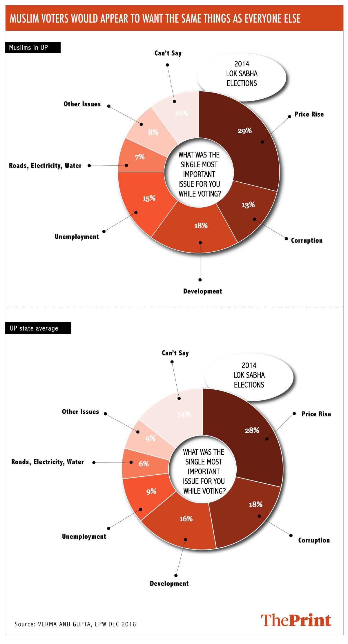 Certainly, Muslims largely give the same answers in opinion polls as Hindus do. Answers that can mask the complex decision matrix that governs vote choice. Looking at 15 years of data from Lokniti-Centre for the Study of Developing Societies’ (CSDS) election studies, political scientists Rahul Verma of the Department of Political Science at Berkeley University and Pranav Gupta of Lokniti-CSDS found that the self-reported biggest priorities of Muslims in Uttar Pradesh were no different from that of any other major community in the state, in an article for the Economic & Political Weekly in December 2016.