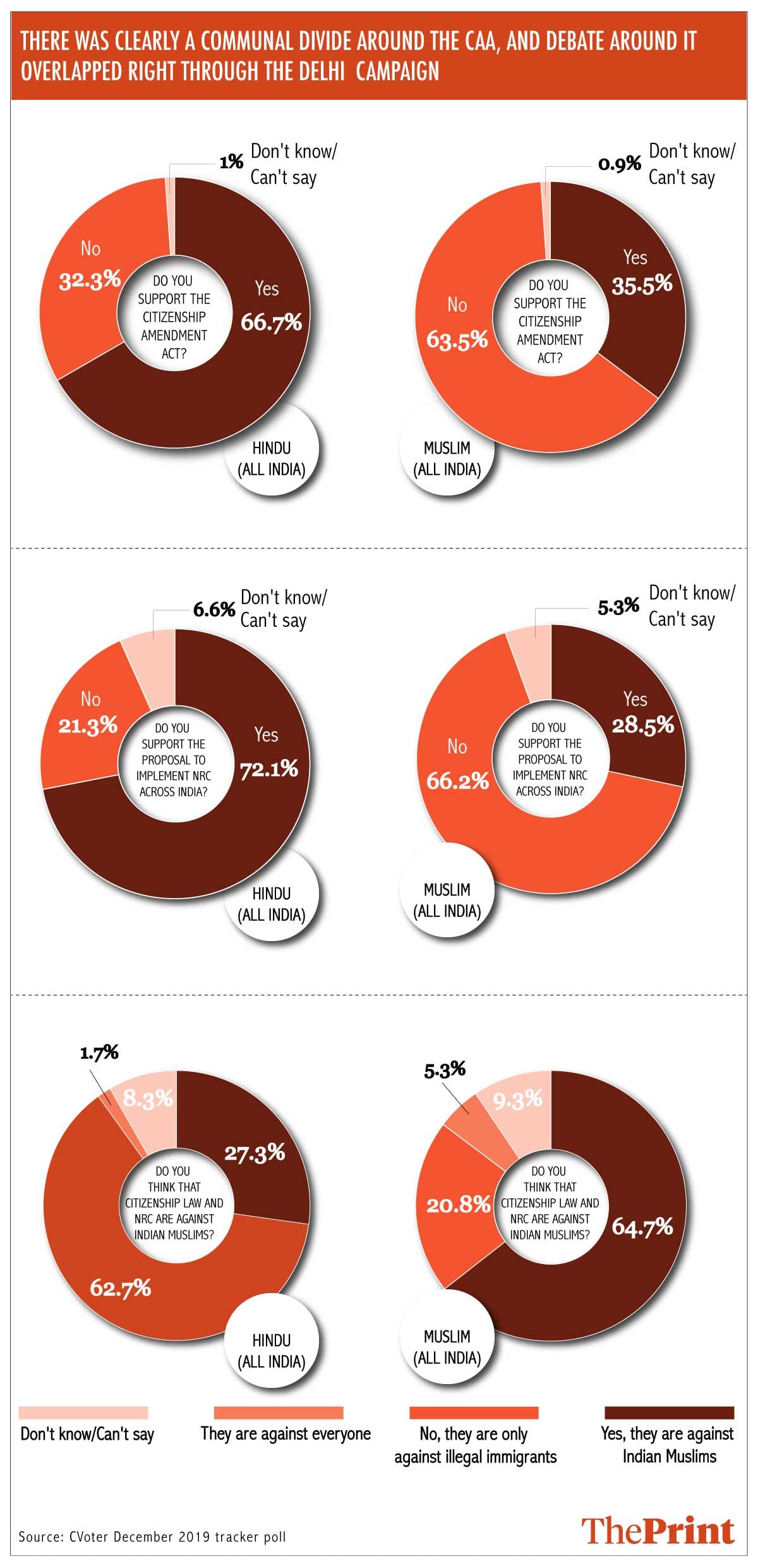 Yet we know that Delhi voters were aware of the Shaheen Bagh protests (80% of voters said they were aware of it in Lokniti-CSDS’ election-eve survey), and Hindus in India supported the CAA while Muslims largely opposed it (as of CVoter’s December 2019 poll).