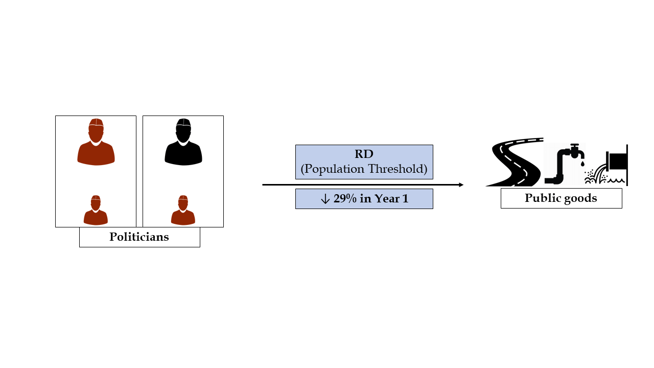To understand how caste differences affect public good provision, we use a common econometric technique called the Regression Discontinuity (RD) design. In Bihar, gram panchayats are assigned an SC upper-tiered representative if the Scheduled Caste population of the gram panchayat crosses a particular number. An RD design involves comparing gram panchayats whose populations fall extremely close to that number, so that they look similar across most dimensions, but vary in whether or not the upper-tiered representative is from a Scheduled Caste background. This allows us to see what happens when Scheduled Caste lower-tiered representatives face caste differences.
