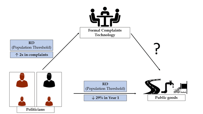 Does filing complaints change incentives of upper-tiered representatives and improve WAS public good provision? We conduct a large field experiment — called a Randomised Controlled Trial (RCT) — across 1,629 lower-tiered jurisdictions from gram panchayats whose total population is nearly 15 million. We provide information regarding the formal complaints technology and offer to file complaints (online) regarding WAS project initiation on behalf of randomly selected lower-tiered SC representatives.
