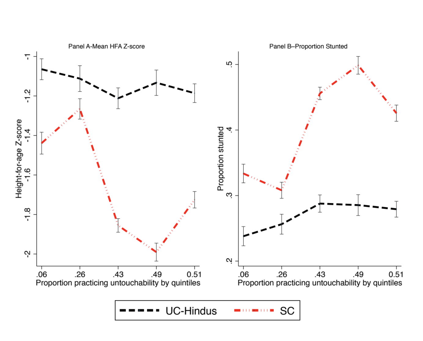 Figure 6 shows that Dalit children’s HFA Z-score sharply decreases in areas where the practice of untouchability is more prevalent. In contrast, there is a much weaker association between height/chronic malnutrition levels and the proportion of households reporting practicing untouchability, for upper caste children. We also explore the impact of the practice of untouchability on the whole pathway of child development. Our results show that the areas where households are more likely to engage in the practice of untouchability are the same areas as those where SC mothers and children are less likely to be able to access or use a whole range of antenatal and postnatal health inputs.