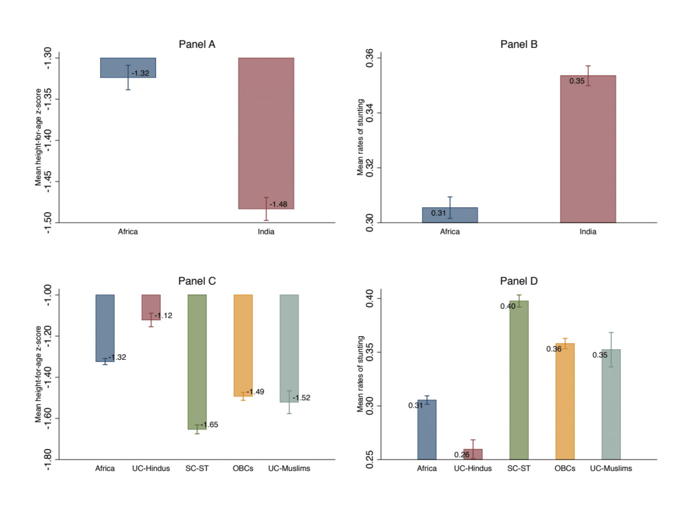 The India-SSA comparison, however, elides over the crucial inequalities that exist within Indian society. In Panel C and D of Figure 1, we plot the average HFA Z-score and rates of stunting for SSA and the four major social groups in India: the upper caste Hindus (UC-Hindus), Scheduled Castes and Tribes (SC-ST), Other Backward Classes (OBCs) and upper caste Muslims (UC-Muslims, i.e., Muslims that don’t identify themselves as SC or OBC). The four-way classification accounts for the two key cleavages in Indian society: caste and religion.