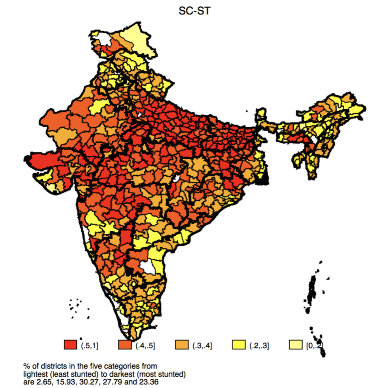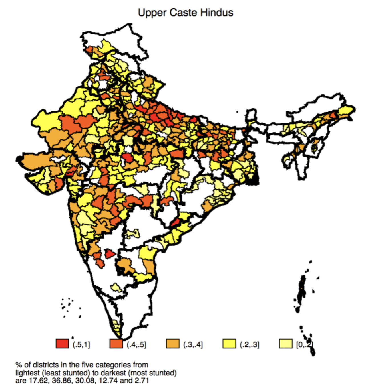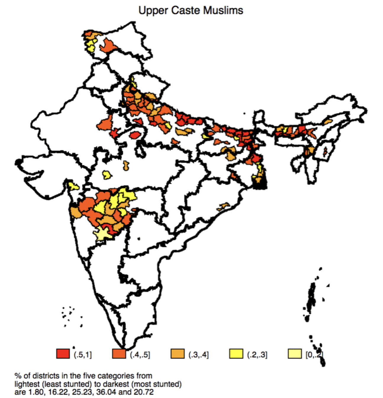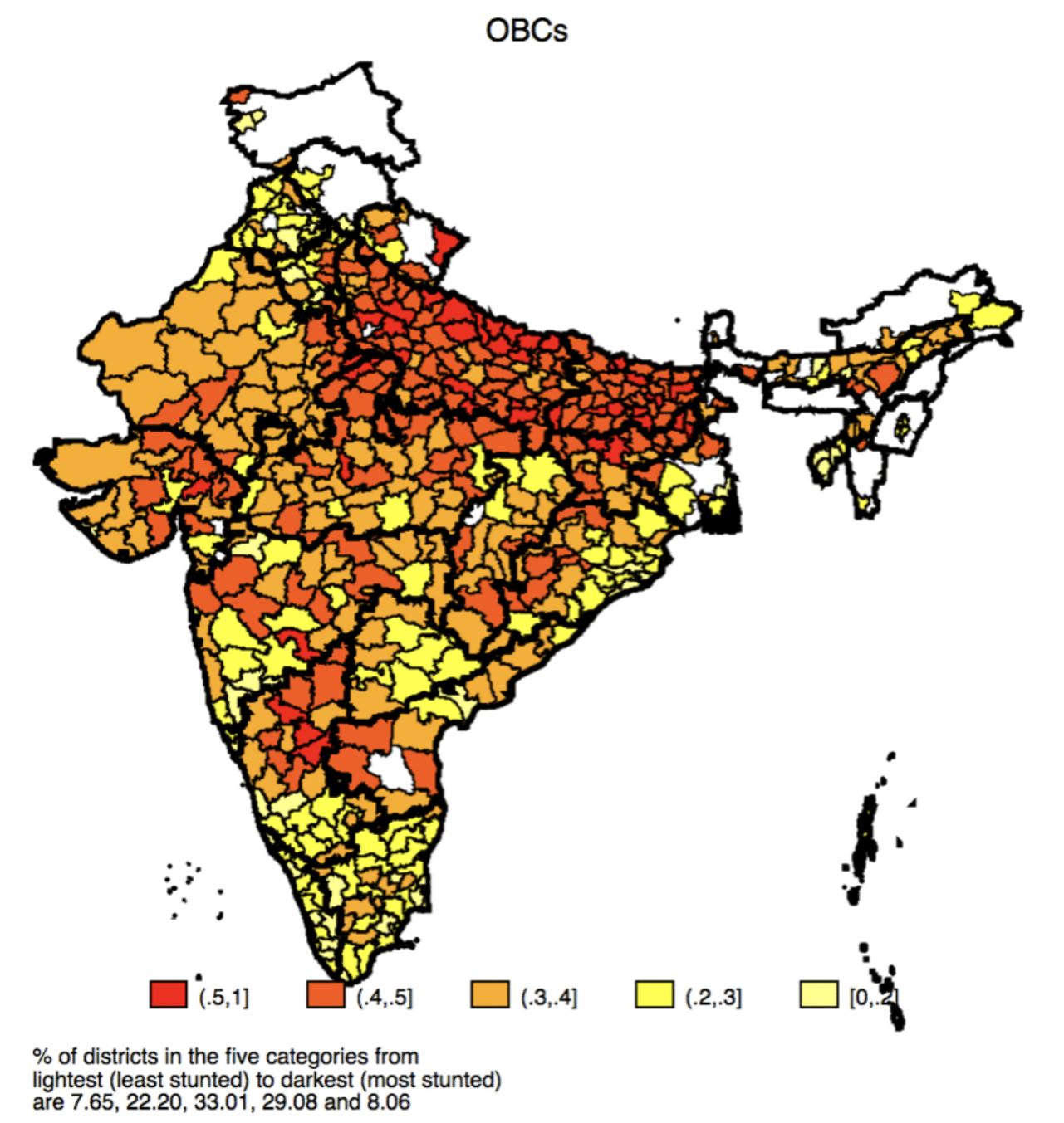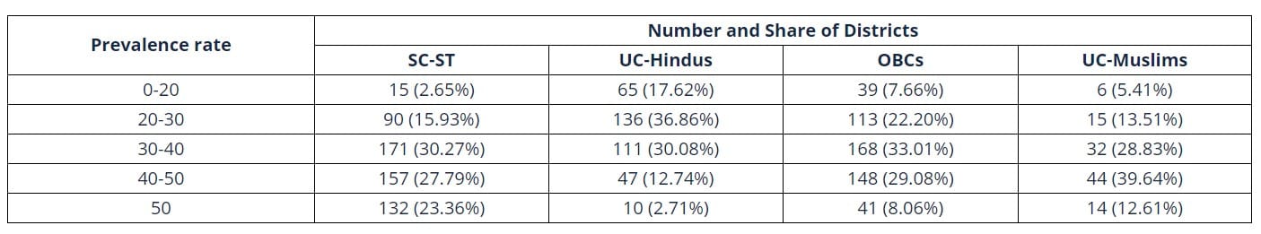 Summing up, the proportion of districts where rates of stunting are more than 40% (i.e., extremely high) are 15% for UC Hindus; 37% for OBCs; 51% for SC-ST and 57% for UC Muslims.