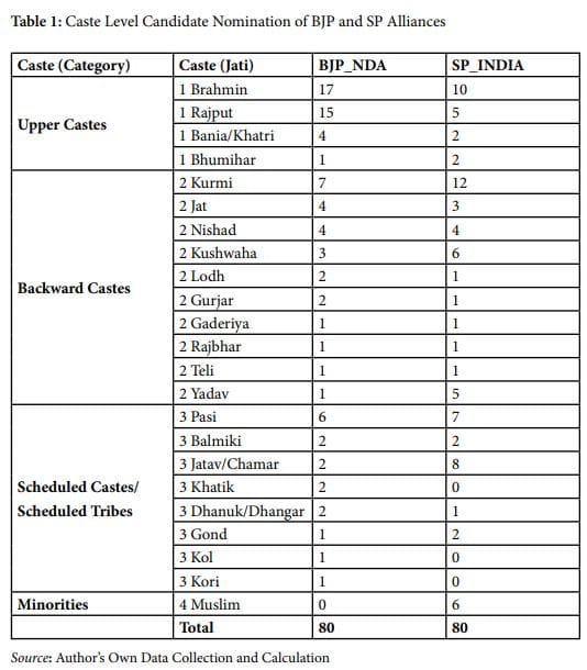 However, the BJP-led National Democratic Alliance (NDA), which comprised Rashtriya Lok Dal (RLD), Apana Dal (S), Nishad Party, and Suheldeo Rajbhar Bhartiya Samaj Party (SBSP), secured only 36 seats, while the SP-led Indian National Developmental Inclusive Alliance (INDIA), which comprised Indian National Congress (INC), won 43 seats. This has rekindled discussion on the importance of caste in candidate nomination and electoral outcomes. One factor widely discussed in the media as contributing to the opposition’s success was the caste background of the candidates (Tiwari, 2024; Salaria, 2024; De, 2024; Mishra, 2024).