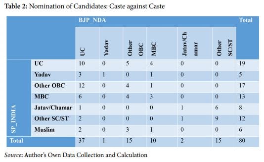 Finally, there is growing discussion about the nomination of candidates in terms of caste against caste. Table 2 provides a brief analysis of the nomination strategy of the BJP and SP alliances in terms of caste against caste. The table reveals that, against the 37 upper caste candidates of the BJP alliance, the SP alliance nominated 10 candidates from the upper castes, 12 from Other OBCs, and 6 from MBC backgrounds.