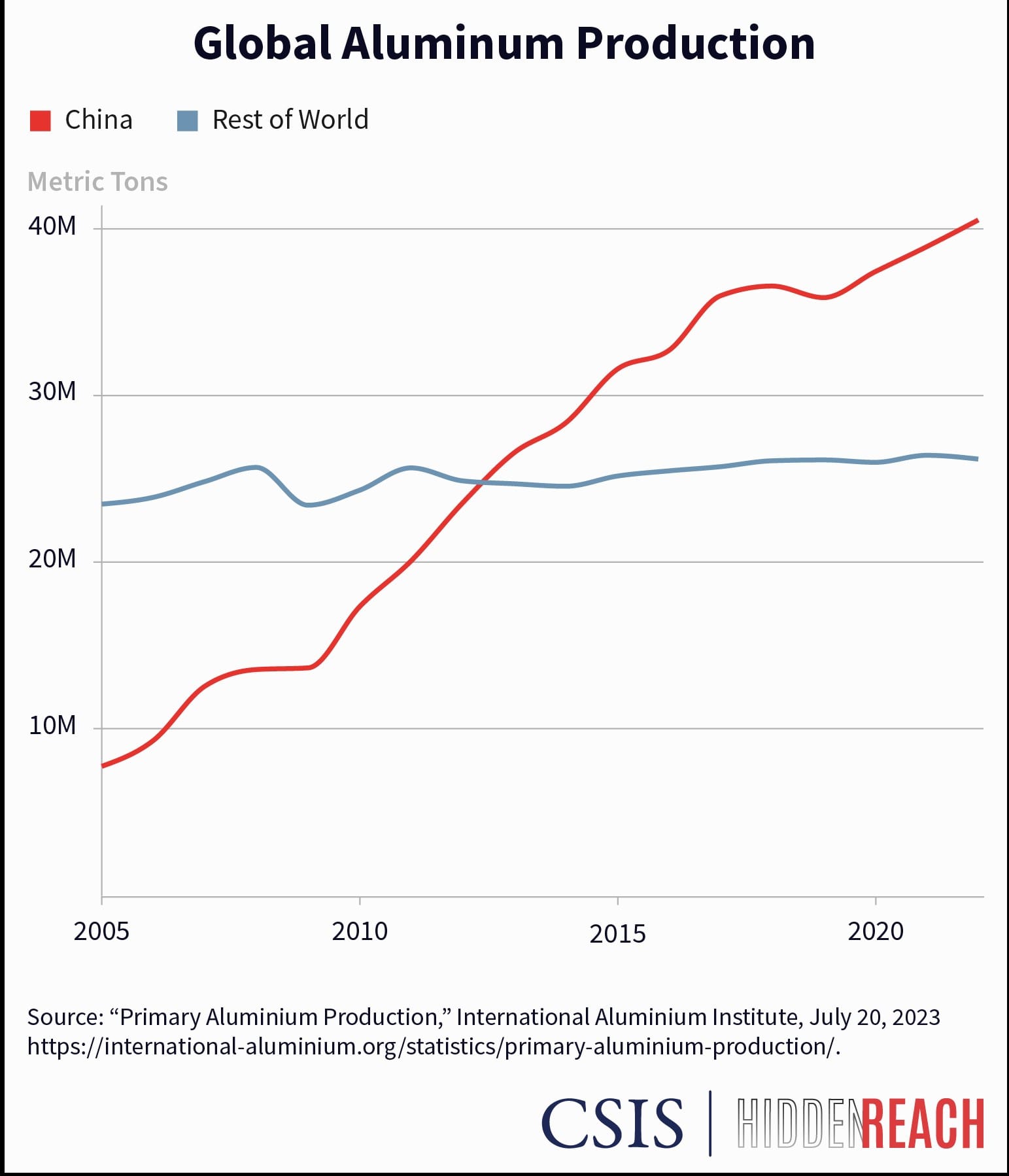 China’s emergence as an industrial powerhouse has driven explosive growth in its aluminum industry. Assisted by extensive government subsidies and tax incentives, China experienced a tenfold increase in aluminum production (from 4.2 to 40.2 million tons) between 2000 and 2022. Today China supplies approximately 59 percent of the world’s aluminum.