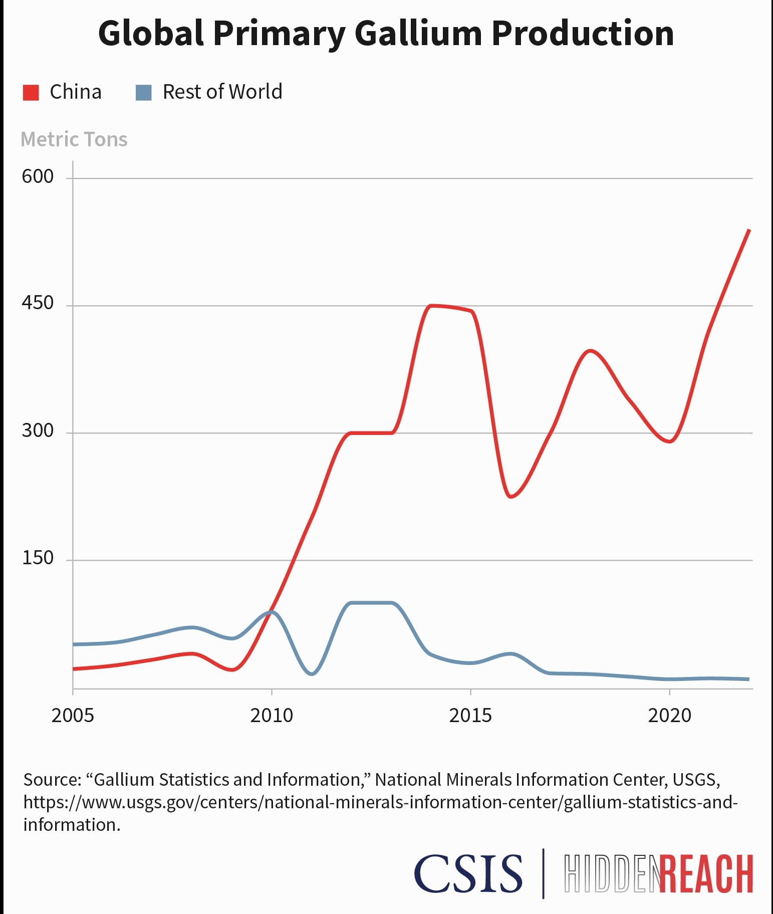 As of 2022, China produced a staggering 98 percent of the world’s supply of raw gallium. This virtual monopoly is largely a result of China’s position as the global leader in aluminum production—the process through which most gallium is extracted. Over the past few decades, deep government subsidies and tax incentives have fueled the rapid rise of China’s domestic metals industry, which has forced most global producers out of business, leaving China as one of the world’s only remaining producers of gallium.