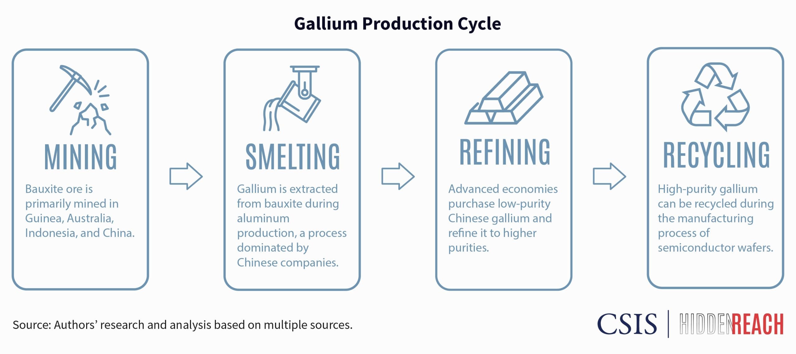 China’s control over gallium supply chains came about indirectly. Gallium differs from some other key minerals like lithium, nickel, and cobalt in that it is not recovered directly from the earth. Instead, gallium is largely a by-product of processing bauxite, the primary ore for aluminum. Gallium production is therefore closely tied to the dynamics of global aluminum markets.