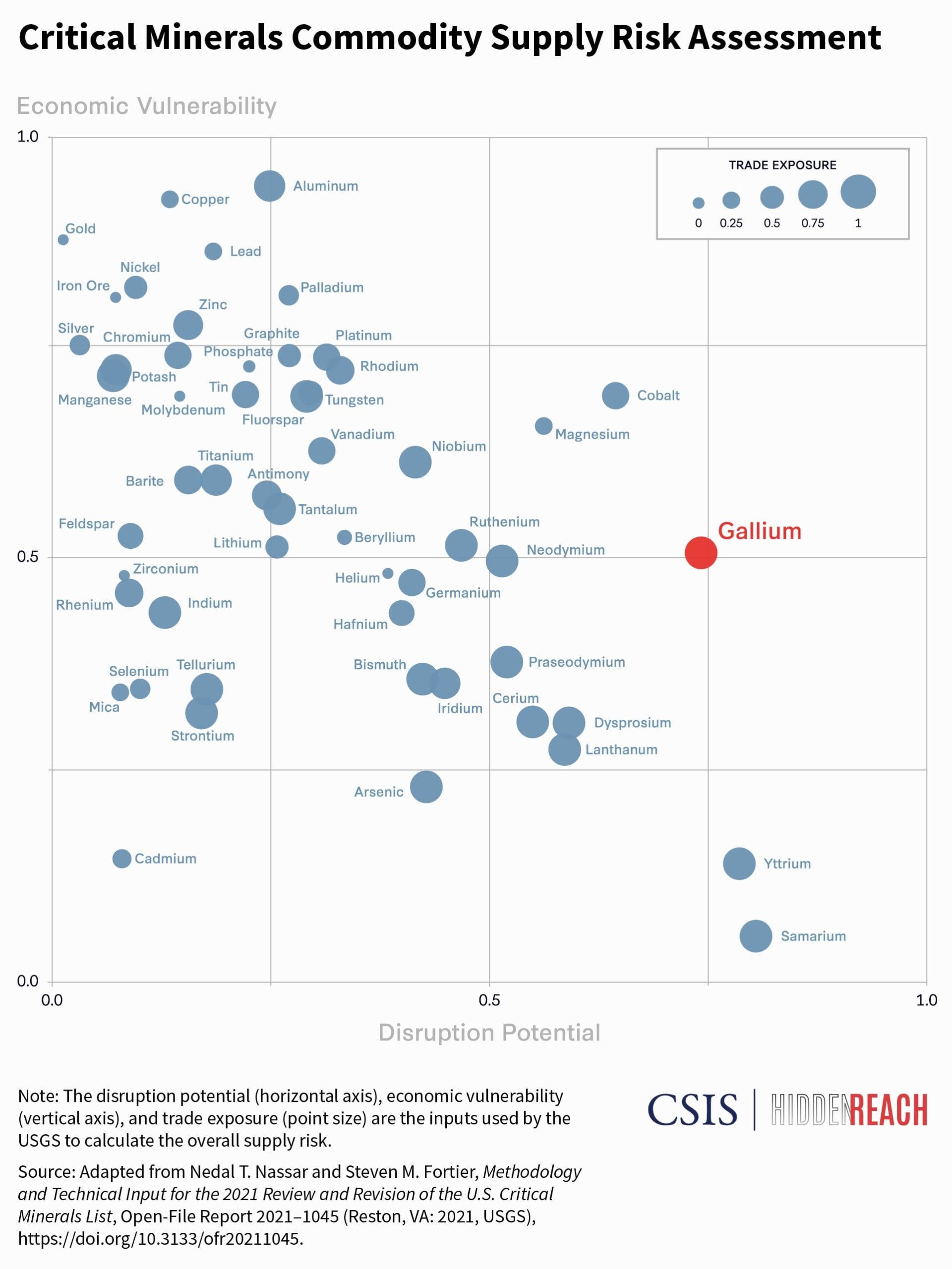 Heightened U.S.-China tensions have further elevated concerns. In 2020 the Trump administration declared U.S. critical mineral dependencies (including on gallium) a national emergency. In 2021 the Biden administration published a 100-day supply chain review warning U.S. reliance on China for gallium risks disruptions that would have “far-reaching impacts on semiconductor production.” A 2023 draft critical mineral assessment report released by the U.S. Department of Energy also defines U.S. supply of gallium as “critical” in both the short and long terms, one of just six minerals to receive such designation.