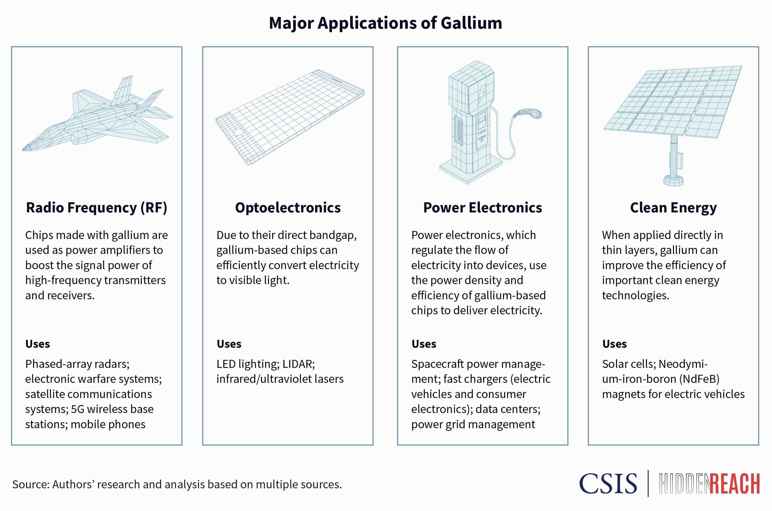 While relatively unknown to most people, gallium plays a critical and unique role in modern electronics supply chains, especially within the defense industry. Its unique properties allow for the production of specialized semiconductors that are vital to advanced capabilities like next-generation missile defense and radar systems, as well as electronic warfare and communications equipment.