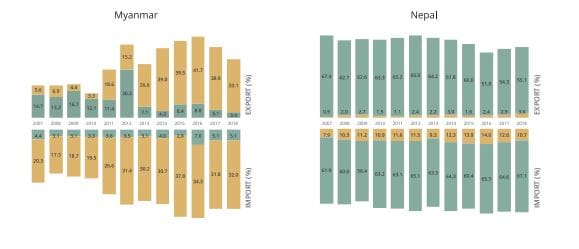 China’s trade with the N8 neighbours is mainly export-driven (Figure 4), making it a top source of goods to South Asia. Despite the existence of regional and bilateral FTAs, India’s trade volume with its neighbours has remained well below in value to that of China, which has only one FTA in the region (Figure 2).