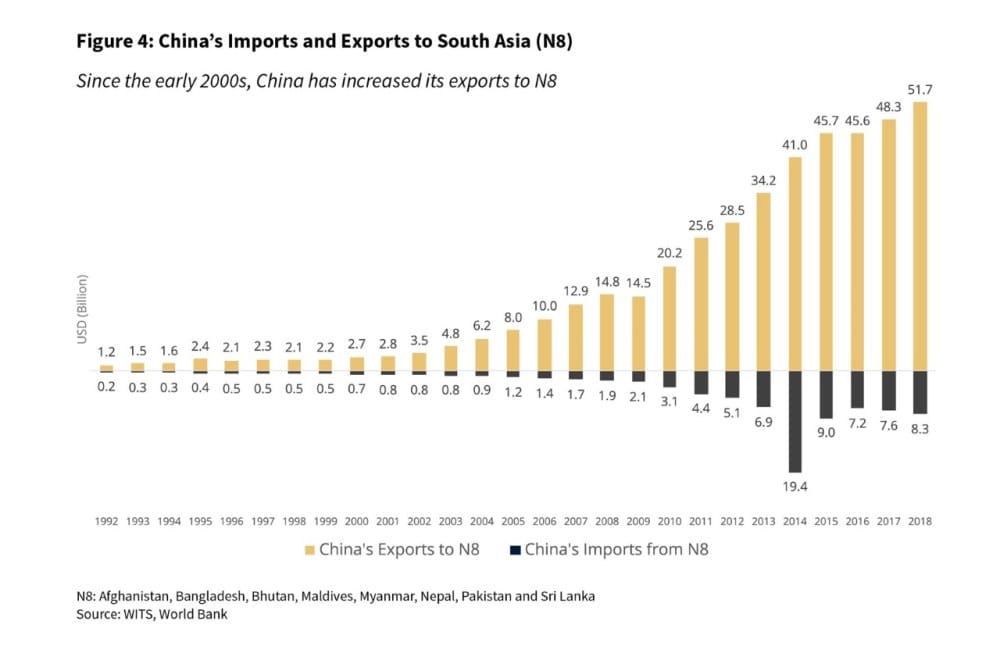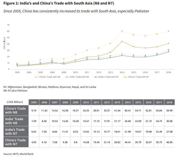 In the last two decades, China has established itself as a major trade partner of South Asia. Beyond Pakistan, China has made inroads into South Asia (N8) by becoming Bangladesh’s top trading partner in 2015, and bolstering trade and investment with Nepal, Afghanistan, Maldives and Sri Lanka. This mainly reflects the region’s strategic importance for China’s Belt and Road Initiative (BRI), particularly the smaller South Asian countries.