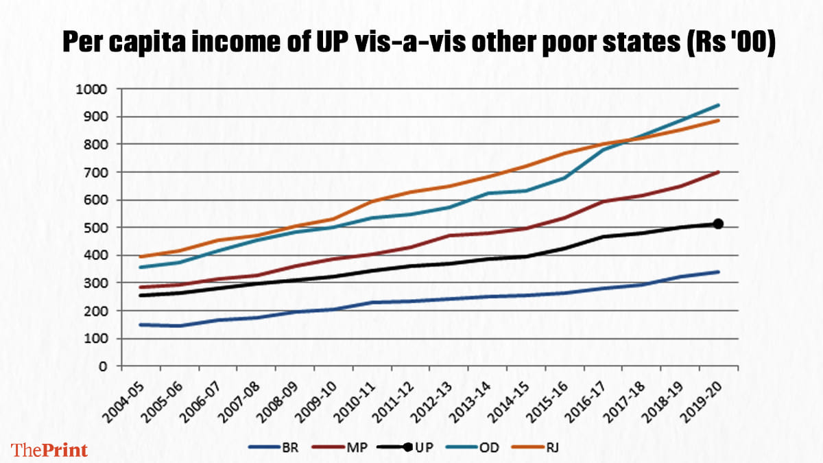 A few points may be noted here. First, the per capita income of UP is slightly more than Bihar’s, and lower than that of other three states. Second, Odisha has recently overtaken Rajasthan to emerge as the leader in this club. Third, the relative positions of these five states have remained the same over a decade and a half. The absolute gap only appears to be widening. Finally, the trajectory of UP does not show any dramatic change since the incumbent government came to power in March 2017.