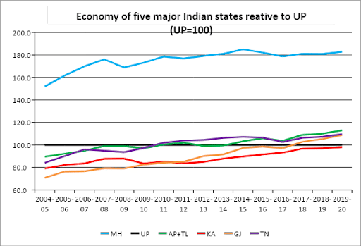 How does the economy of Uttar Pradesh compare with other major Indian states? We plot five largest economies of India relative to the size of UP’s economy, normalised as 100 (Figure 1). The horizontal line at 100 denotes Uttar Pradesh. The first thing to note is that Maharashtra is the largest Indian economy, roughly 1.8 times that of UP since last one decade. All other four states — Andhra Pradesh (including Telangana), Karnataka, Gujarat, and Tamil Nadu — had economies smaller than that of UP as late as 2009-10. Three of these four have surpassed the size of UP’s economy. Karnataka, too, is likely to surpass UP in just a few years, because of its relatively higher growth rate.