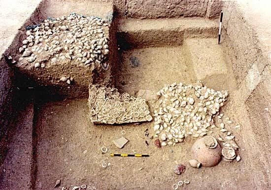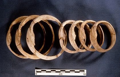 During the excavation in one of the graves from the lower level, the excavators found the deceased buried with shell bangles. This 8000-year-old evidence, when correlated with many shell bangles from various Harappan sites like Mohenjo-daro and Harappa, proved that shell objects, particularly bangles, were not only precious but are a marker of an extensive trade and production nexus involving shell-working, which was put in place as early as 8000 years ago.