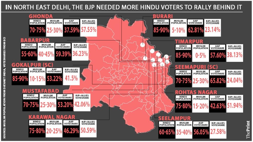 Northeast Delhi, where the riots broke out, has the highest share of Muslims (around 30 per cent) among all constituencies in Delhi, and in February 2020, the BJP was unable to get the non-Muslim voters to fully rally behind it.
