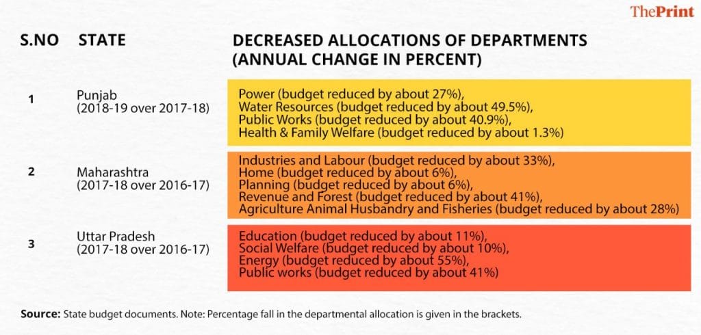 Of course, with farm loan waivers, allocations of implementing departments increased manifold. In Punjab, allocations of ‘agriculture’ department increased by 66 per cent; in UP, that of ‘agriculture and allied activities’ department increased by 610 per cent and in Maharashtra, that of ‘cooperation marketing and textiles’ department grew by 887 per cent.