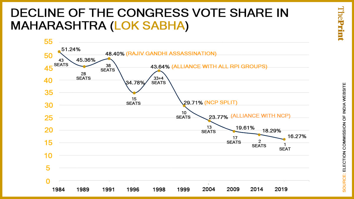 This is the party, which once had a stranglehold on Maharashtra all through the 1980s and 1990s. It started losing the grip in the 2000s. Long and continued neglect of the Congress base in Maharashtra, ensuing confusion in the upper echelons of the party in Delhi, complete lack of state leadership, infighting in the party, and the erosion of its traditional vote bank are the primary reasons for its decline to almost a point of no return.