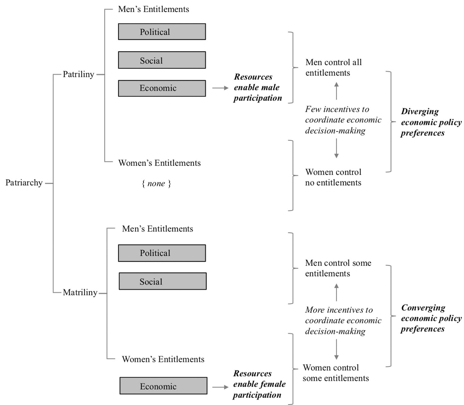 The reversal of gendered entitlements to resources in matrilineal societies is radical because it occurs within larger patriarchal systems where men hold social and political entitlements. As a result, lineage norms not only enable women’s political engagement but also alter incentives for gender-based coordination within families.
