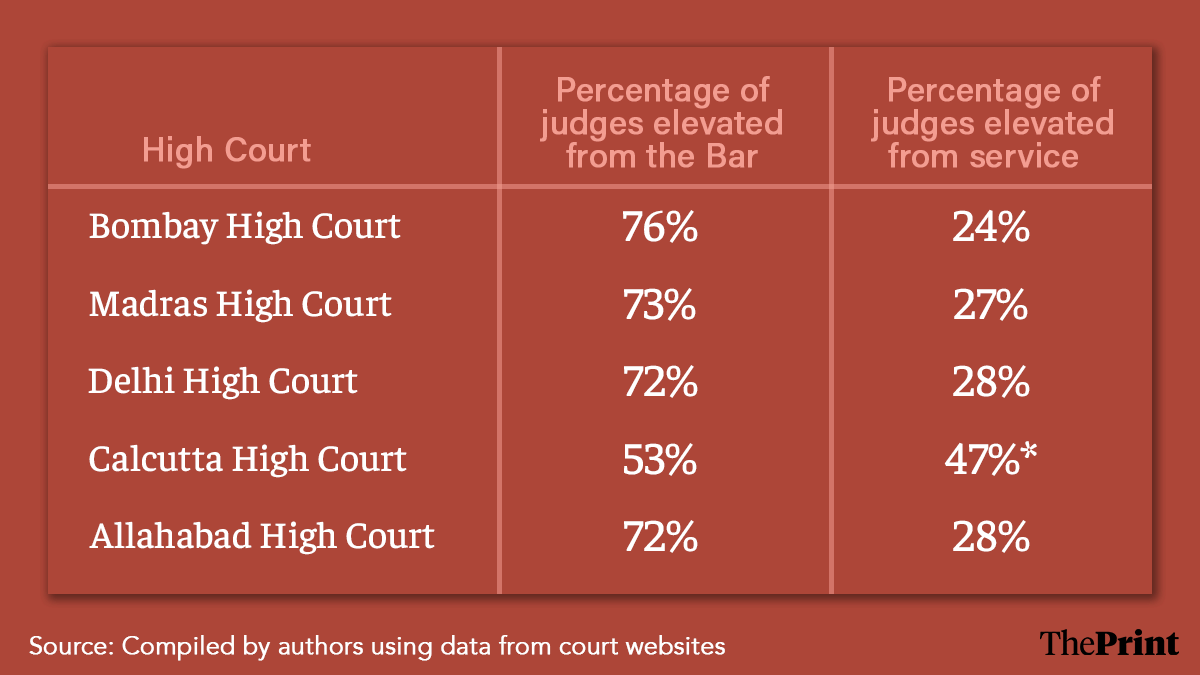 Our analysis of data from major high courts reveals that roughly three quarters of judges are elevated directly from the Bar. The highest percentage composition for service elevated judges is at the High Court of Sikkim. Deceptively at a 50-50 split, the court has just two judges as of 14 December — one of whom has been inducted from service and the other from the Bar. There is not a single case wherein the percentages switch the other way round.