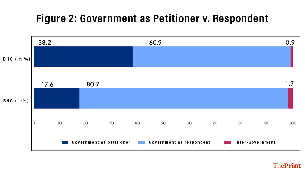 Next, we identify the cases that the government initiated. In the Bombay High Court, less than 20 per cent of the government litigation is initiated by the State. In the Delhi High Court, there is a 40-60 split between the government as a petitioner versus the respondent.