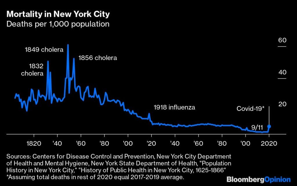 Still, in terms of the burden on hospitals and the sheer shock to the city and its economy, Covid-19 really does rate among the greatest public-health challenges (or disasters, if you prefer) of New York’s history. Readers of the city’s annual vital statistics reports will be remarking upon it for centuries, assuming that chart keeps running on the cover — and that the city continues to exist, of course.