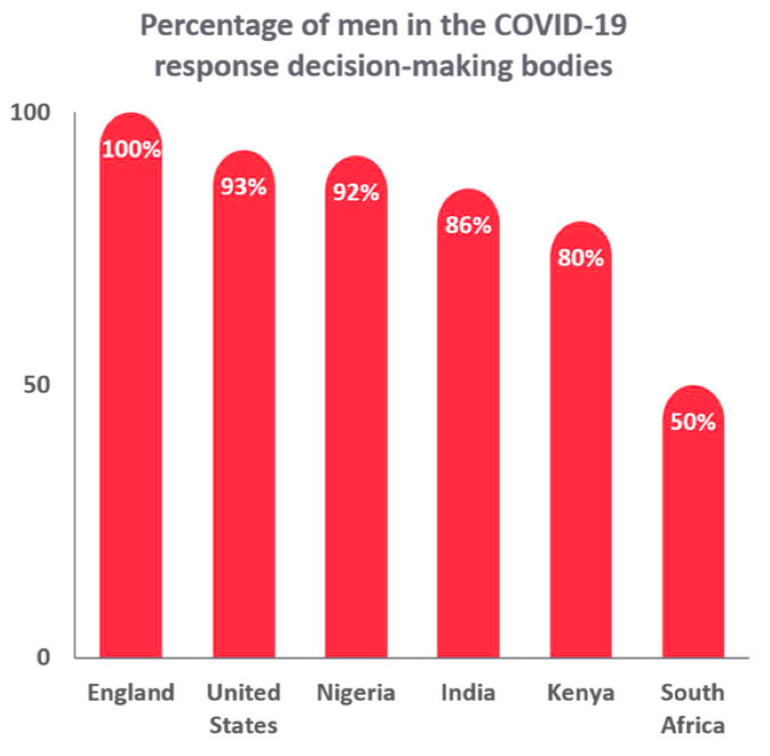 Political challenges: In five of the six analysed countries, women have been largely locked out of Covid-19/coronavirus-related decision-making at a national level. Globally, men were found to be overwhelmingly in charge of the response to Covid-19 and of policy making in relation to it. Women, therefore, although more likely to be frontline health workers, were much less likely to have the agency to act strategically on matters related to Covid-19.