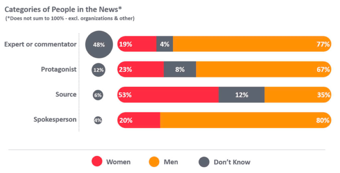 Covid-19/coronavirus news stories overwhelmingly amplify men’s expertise and dial down women’s: Women are more likely to be used as sources sharing subjective views than experts sharing authoritative expertise. Women constituted only 19% of all experts (vs. 77% men) but 53% of sources (vs. 35% men).