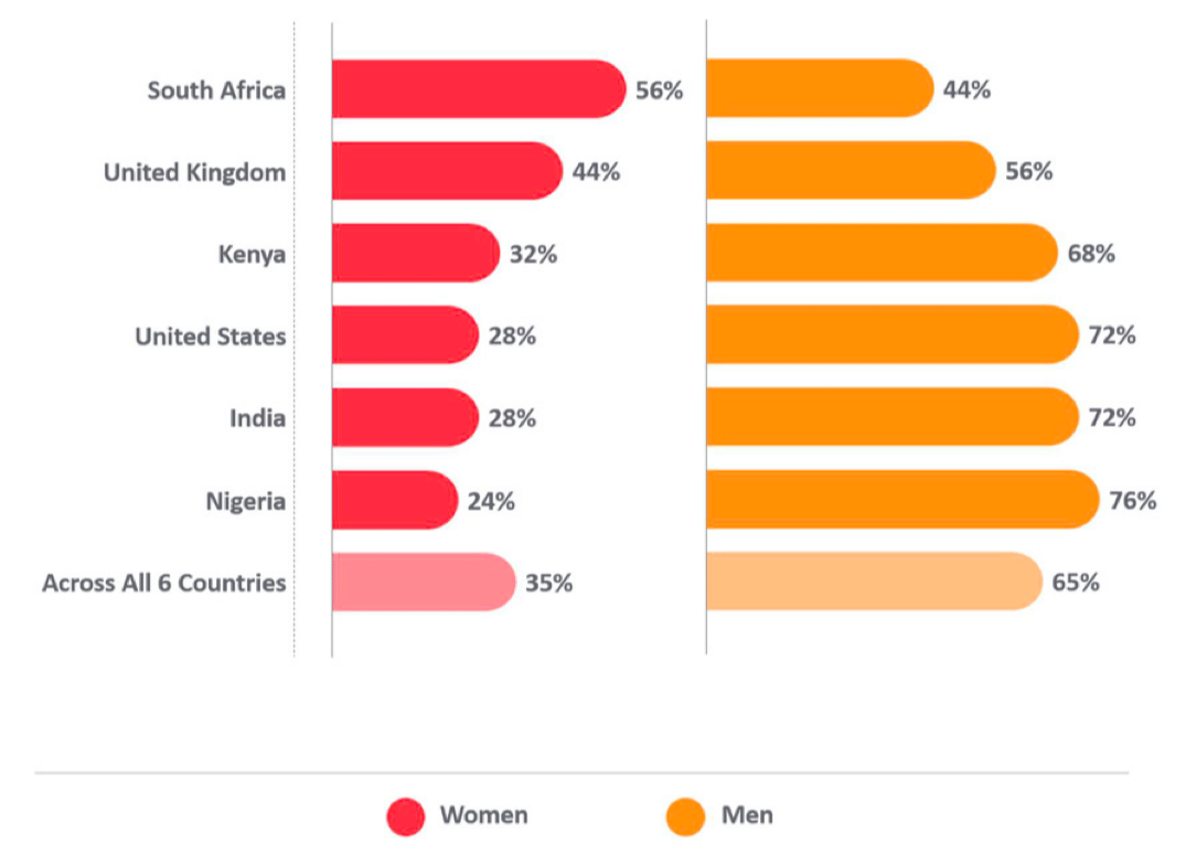 Women have been crowded out as protagonists (even more so than in non-Covid news coverage): The computational content analysis of 44,164 sampled stories across the six countries showed that women were nearly five times less likely to feature as protagonists in news coverage headlines than men in the US, nearly four times less likely to do so in South Africa and Nigeria, three times less likely in India and Kenya and nearly three times less likely in the UK.