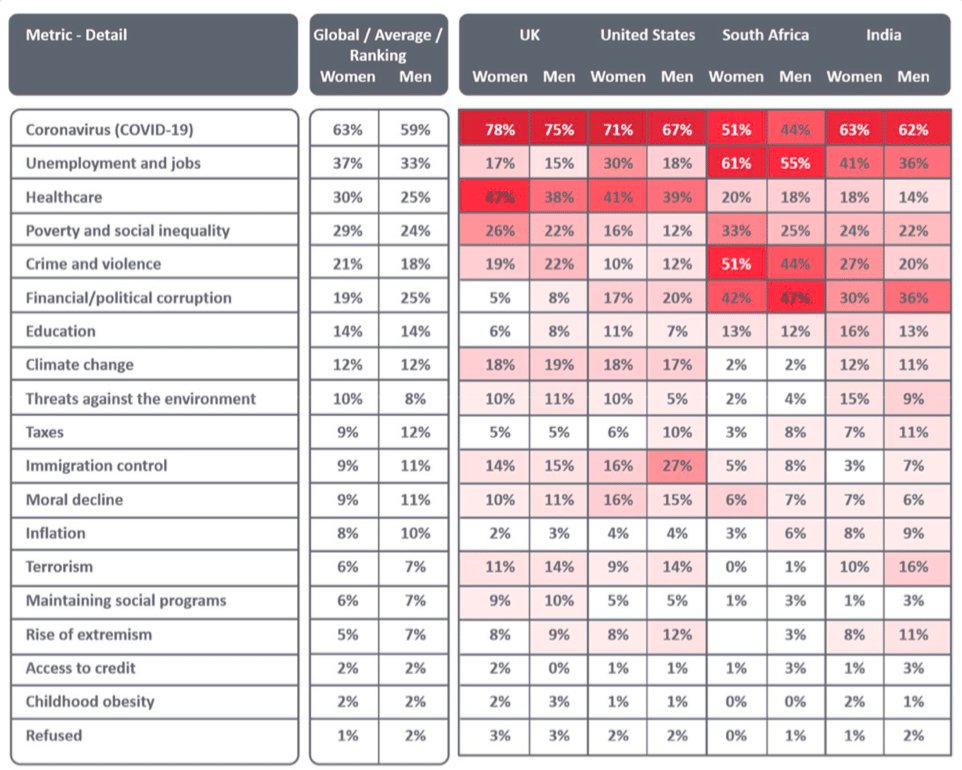 Women were noticeably more worried than men about the three biggest worries in all four countries. Women in the US were slightly more worried than men about coronavirus (71% vs. 67%) but much more worried about unemployment/jobs than men (30% vs. 18%)