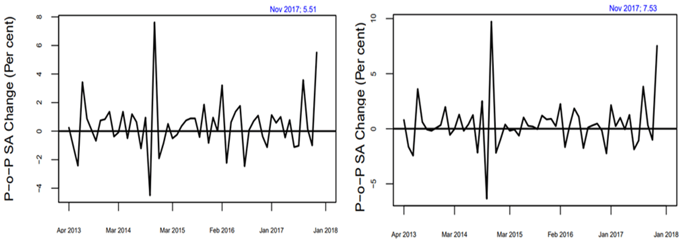 Technically, seasonal adjustment corrects for the systematic fluctuations that we commonly observe, such as change of seasons, festivals, period of tax filings, end of financial year or even monsoon. As some months have some peculiar reason for a sharp rise of a fall, they invariably distort the usual movement of the index. The point worth noting is that even after removing the base effect and seasonal variations we notice a surge in growth rate.