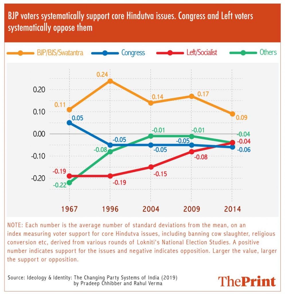 In their book ‘Ideology and Identity: The Changing Party Systems of India’ published in 2018, political scientists Pradeep Chhibber and Rahul Verma demonstrated that Indian political parties and voters are strongly and consistently ideological. As part of the book’s quantitative work, they constructed an index of “the politics of recognition”, which looked at voter responses to questions relating to key issues of identity in successive rounds of post-election National Election Studies conducted by the Lokniti programme of the Centre for the Study of Developing Societies (CSDS).