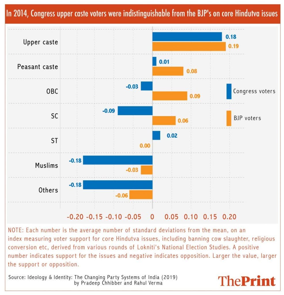 The surveys asked voters for their views on the banning of cow slaughter, religious conversion and other key “core Hindutva” issues, among other questions. Chhibber and Verma then coded these responses to determine whether Congress and BJP voters were ideologically dissimilar.