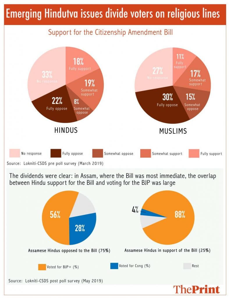 Since the first term of the Modi government, while older “core Hindutva” issues, including the banning of cow slaughter and religious conversion, forcefully integrating Kashmir with the mainland through the scrapping of Article 370, and building a Ram Mandir in Ayodhya have been revived, the BJP has also come up with newer core Hindutva 2.0 issues. Top among these is the Citizenship Amendment Bill (passed by the 16th Lok Sabha, but not taken up by the Rajya Sabha, and sent to a joint committee of Parliament) that seeks to grant citizenship to non-Muslim illegal immigrants.
