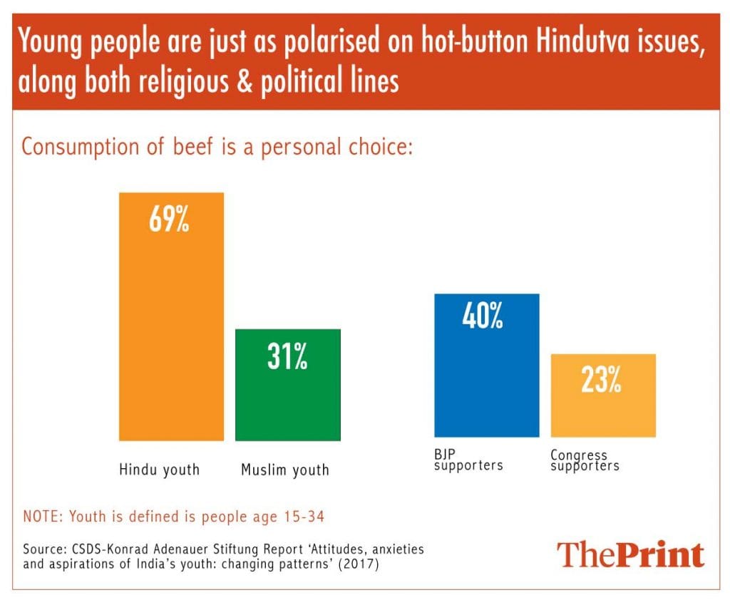 Surveying only millennials (aged 15-34) in 2017, a survey found that Hindu youth strongly opposed the consumption of beef, for instance, as did BJP-supporting young people.
