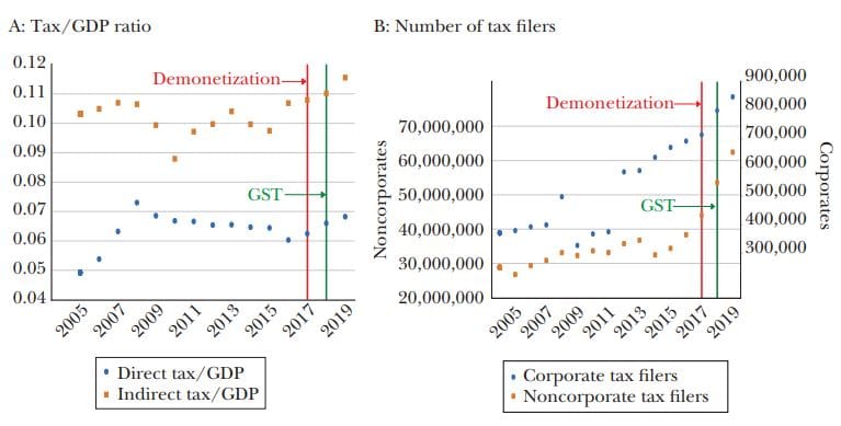 Note: The figure in the left panel depicts the tax-GDP ratio for both direct and indirect taxes for the period 2005–2019. The figure in the right panel reports the number of tax filers in India during 2005–2019. The left axis reports the number of noncorporate tax filers, while the right axis reports the number of corporate tax filers.