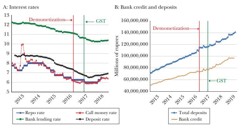 Note: The figure shows the monthly data on different interest rates during January 2013–January 2019 and bank credit and bank deposits in India during January 2013–September 2019. The repo rate is the policy rate of the Reserve Bank of India, and the call money rate is the rate at which short-term funds are borrowed in the overnight money market. The bank lending rate is the weighted average lending rate of banks, while the deposit rate is the weighted average bank-term deposit rate. Bank credit and bank deposits are reported in millions of rupees.