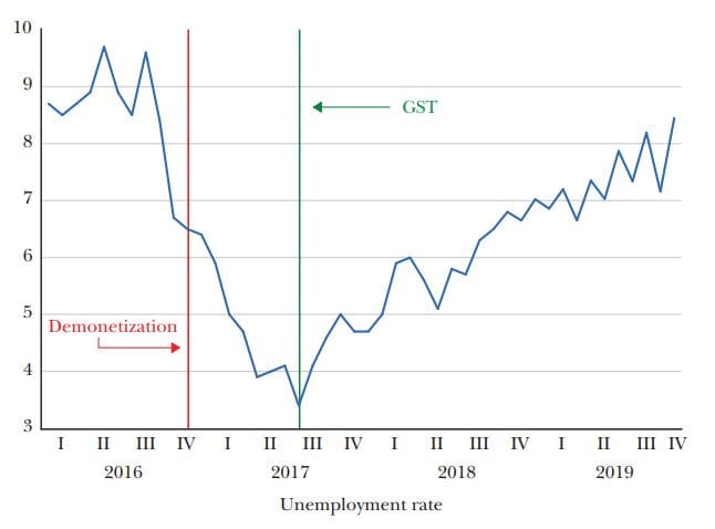 The figure reveals two interesting features. First, the unemployment rate in India was declining throughout 2016. There is hardly any noticeable effect of demonetisation on this declining trend. Second, the unemployment rate begins to rise steeply in India after the introduction of the Goods and Services Tax (GST) reform.