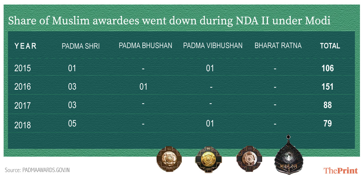 The Modi regime, however, does not stick to this average. The government has given a total of 424 awards (till 2018) and only 15 Muslims are included in this figure. The Muslim share is down to 3.5 per cent.