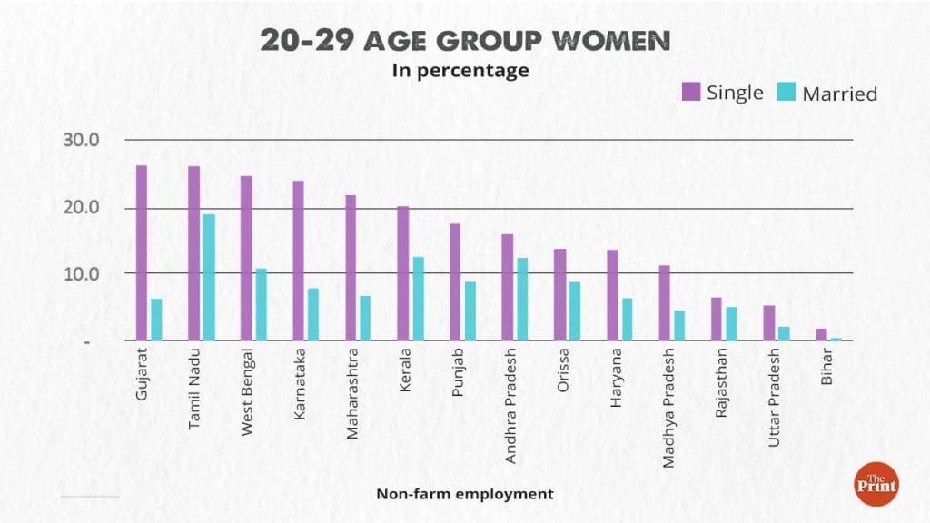 The highest proportion of single young women in paid work in industry and services (non-farm employment) were in Gujarat and Tamil Nadu. When it comes to married young women, while Tamil Nadu continues to have the highest proportion of married young women in non-farm paid work, only 6.5 per cent of married young women working in Gujarat was in industry and service sectors, making it among the states with the least proportion of married young women in non-farm work. In, Karnataka, Maharashtra, and West Bengal, too, the gap between the proportion of single and married young women in paid work in the non-farm sector is high. In contrast, like Tamil Nadu, in Andhra Pradesh, Kerala, and Odisha, there is less difference among the proportion of single and married young women in non-farm work. In Bihar and Uttar Pradesh, almost all young women – both single and married – are economically inactive in non-farm sectors.