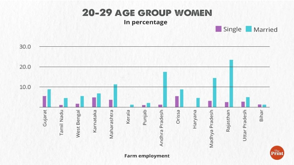 Surprisingly, young women, single or married in Uttar Pradesh and Bihar do not seem to work in a large proportion on farms either (Figure 2). In Rajasthan, Madhya Pradesh, and Andhra Pradesh, a significantly higher proportion of married young women work on farms. In prosperous states of Kerala, Tamil Nadu, Punjab and Haryana, the same proportion is well less than 5 per cent.