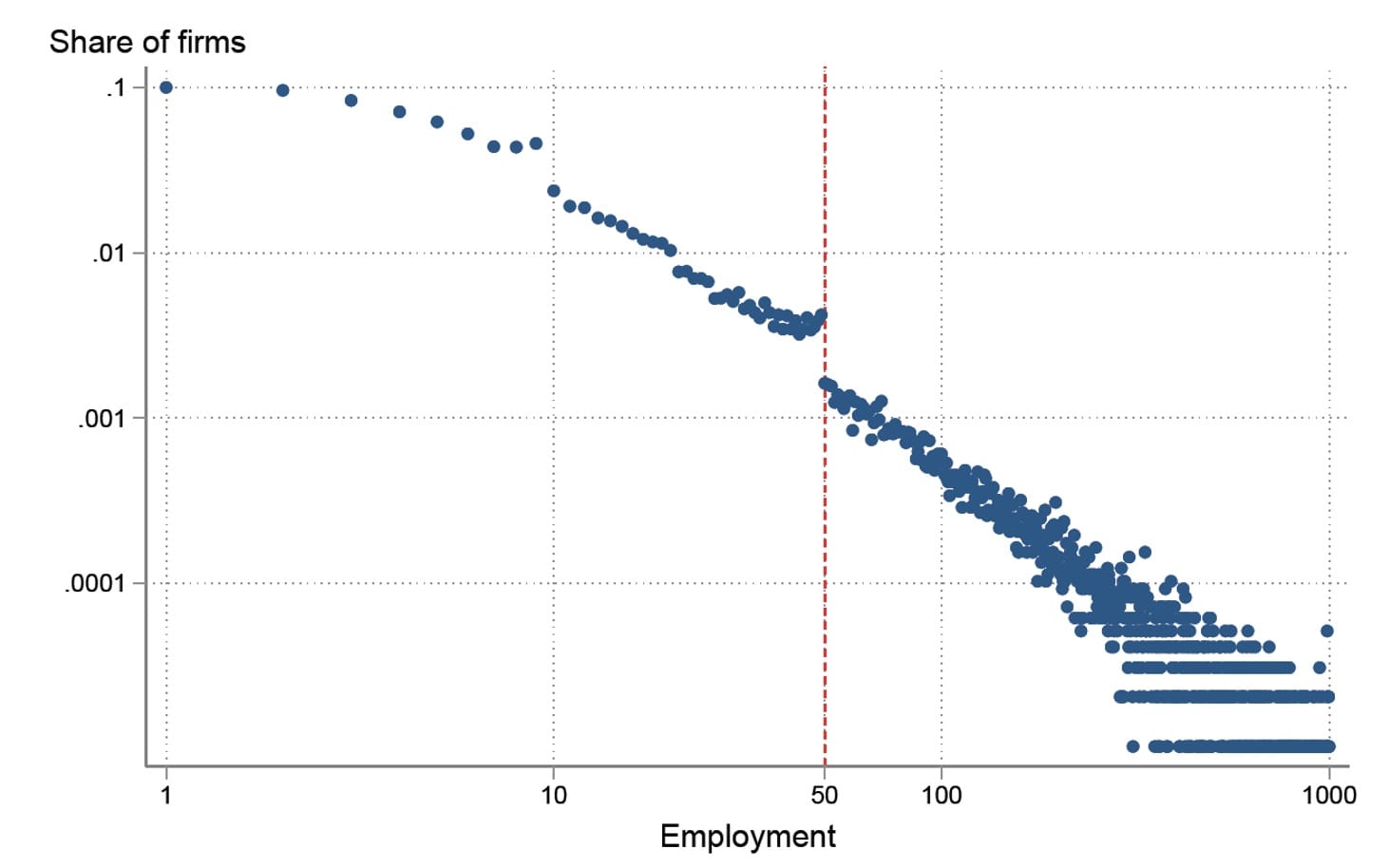Figure 1: The French Firm Size Distribution breaks at 50 employees