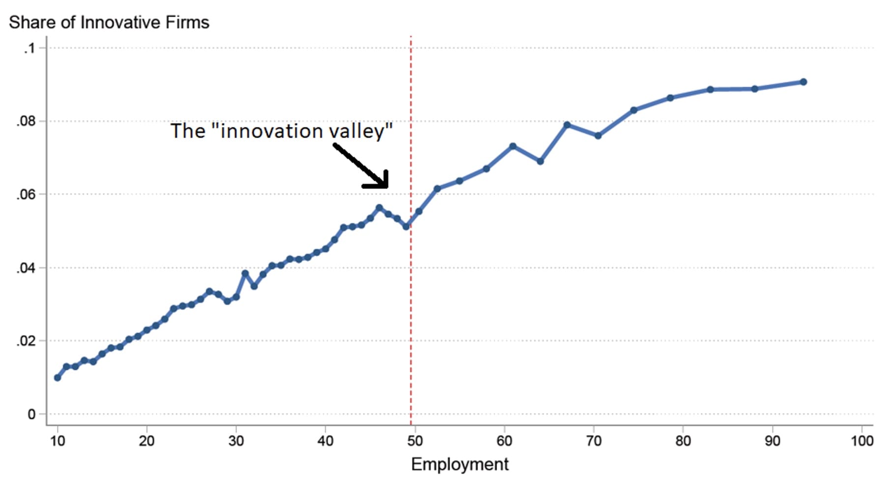 Figure 2 shows that these innovation effects might be happening in the data. The probability of innovating increases with firm size, but there is an “innovation valley” just before 50 employee firms consistent with a discouraging effect. Moreover, the gradient of the innovation-size relationship flattens after 50 employees, also suggesting a regulatory tax.